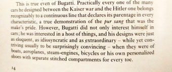 これはブガッティにも当てはまる。カイザー戦争からヒトラー戦争までの間に彼がデザインした多くの車は、実質的にすべて、あらゆる特徴においてその起源を宣言する連続したラインに属していることが認識でき、メーカーのプライドであった真髄を実証している。しかし、ブガッティが興味を持ったのは車だけではなかった。彼は多くのものに興味を持っており、彼のデザインは、ボート、飛行機、蒸気機関、自転車、あるいはつま先ごとに縫い目が入った独自の靴など、車と同じくらい雄弁で、風変わりで、並外れたものであった。そして、通常、驚くほど説得力のあるものにしようとしていた。