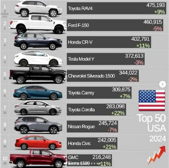 43年 - これがフォードF-150がアメリカで一番売れた車だった。 トヨタRAV4は歴史的なストリークを破り、2024年に米国でベストセラーになった。